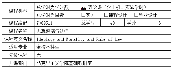 本课程是一门融思想性、政治性、科学性、理论性、实践性于一体的思想政治理论课,是面向全校本科生开设的公共必修课。本课程以习近平新时代中国特色社会主义思想为指导思想,坚持正确的世界观、人生观、价值观、道德观和法治观,把社会主义核心价值观贯穿教学的全过程,通过理论学习和实践活动,帮助学生形成崇高的理想信念,弘扬伟大的中国精神,确立正确的人生观和价值观,加强思想品德修养,增强学法、用法的自觉性,全面提高大学生的思想道德素质和法治素养