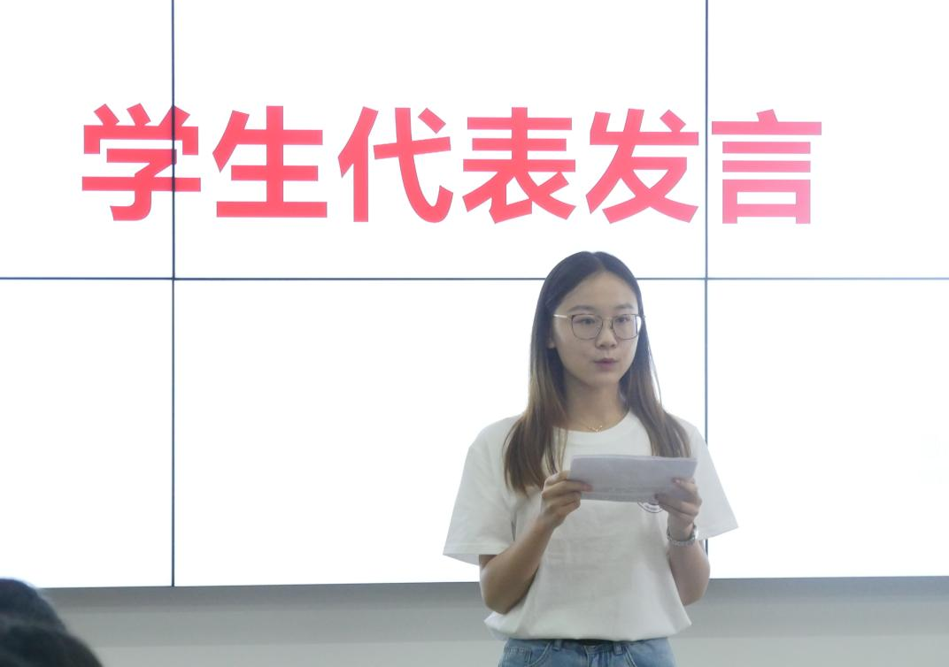 回顾视频中同学们的一颦一笑都是本学期最好的见证,点点滴滴随思绪涌上心头。“21天习惯打卡”活动同学们持之以恒,相互促进;党史微视频大赛中同学们团结协作、开拓创新;“学术三分钟”演讲比赛中同学们文思敏捷、妙语连珠。阳光下是大家沿着跑道走方阵的身影,会堂里是师生们歌颂建党百年嘹亮的歌声。学生代表焦荷清在向本学期兢兢业业、辛勤工作的老师表达感谢后,分享了本学期参与各项活动的心路历程,并激励大家在之后的学习生活中要用行动践行初心、用汗水耕耘希望、用奋斗成就梦想。未来属于青年,希望寄予青年。她呼吁同学们用青春之热血,传递时代之星火。不负时代,不负韶华,不负党和人民的殷切期望。