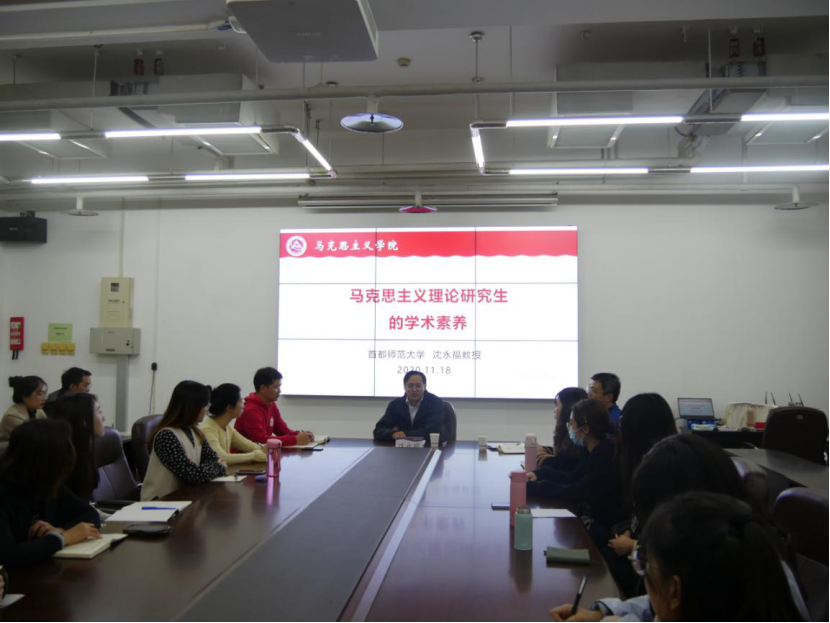 11月18日下午,bat365官网特邀首都师范大学bat365在线中国官网登录入口副院长、北京高校中国特色社会主义理论研究协同创新中心(首都师范大学)常务副主任、北京市伦理学会副秘书长、首都师范大学社会文化史研究中心研究员、北京市委讲师团宣讲专家沈永福教授,在瀚学楼1208会议室主讲题为《马克思主义理论研究生的学术素养》的学术报告,bat365官网全体研究生到场聆听,报告由bat365官网副院长张茂林主持。
